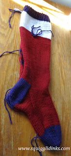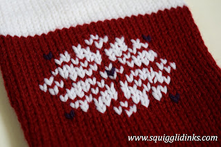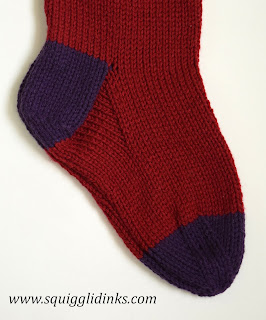 After knitting the basic stockings and sewing them up, I double stitched a snowflake onto each one, centering it on one side of the stocking. You can see in the picture above that I tied a piece of the purple yarn where I would need to center the snowflake. (I tied it just above where the top of the snowflake design would go.)