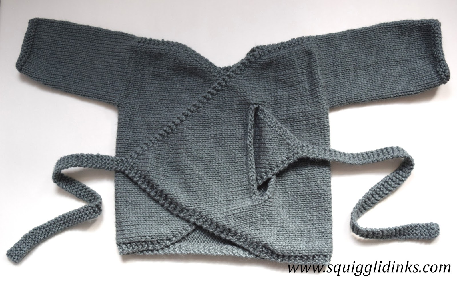 The pattern is knit sideways (which is one of the things I love about it). You start by knitting one of the ties, then increase to knit the body, setting stitches on holders for the sleeves, then decrease and finish with the other tie. Then you pick up the stitches for the sleeves and knit them. (And yes, I did follow the structural part of the instructions.)