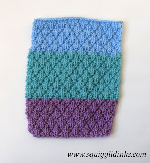 Repeat these 8 rows until block measures 9 inches from cast on edge, changing colors at 3 inches and 6 inches if desired. Bind off.