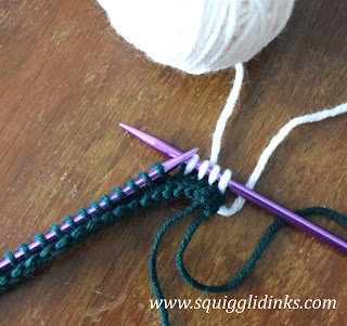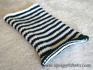 Repeat this pattern until the piece measures 9 inches from cast on edge. (I had 14 stripes of each color.)