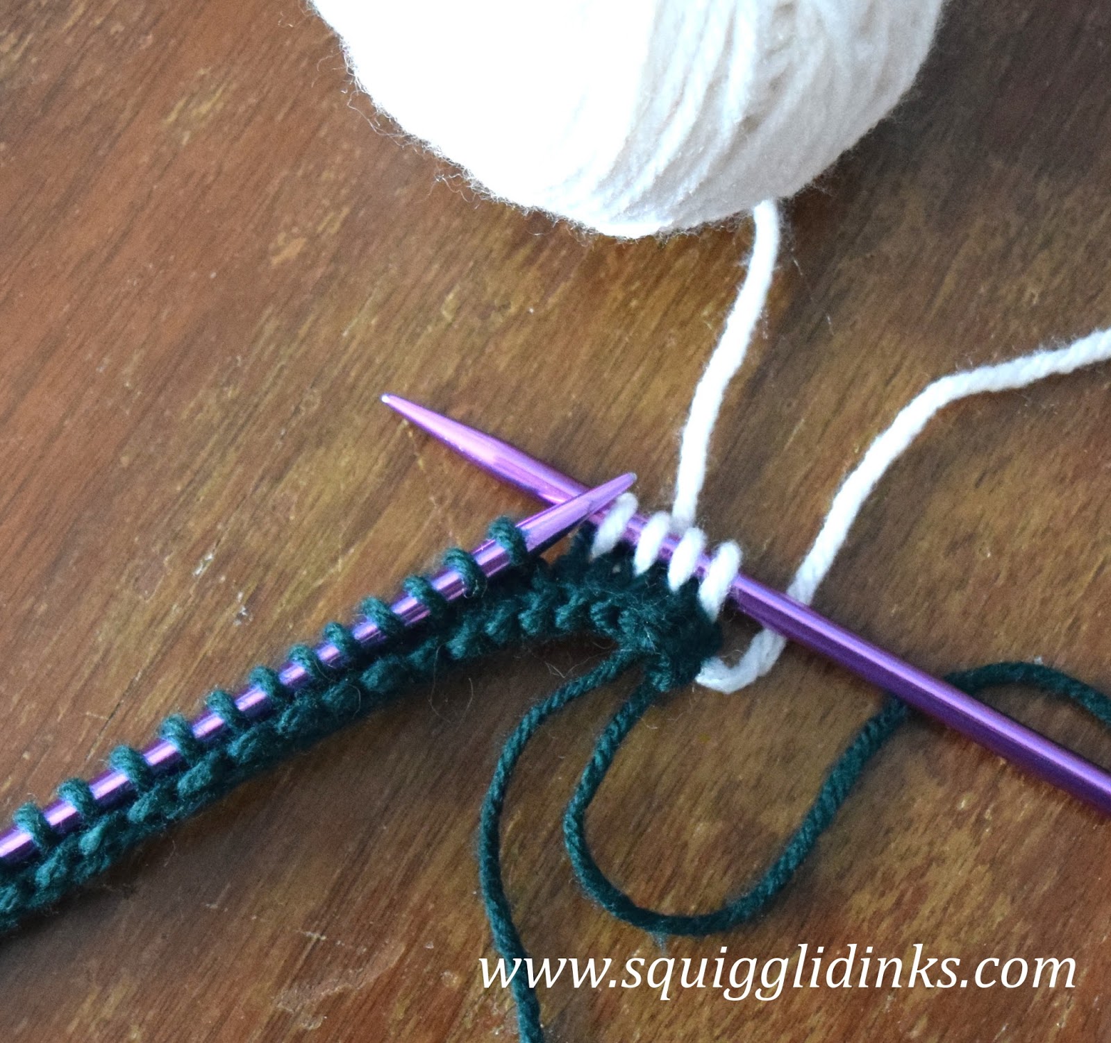 | Begin knitting with Color B. Leave a long enough tail to sew under at the end. A longer tail will also help you hold the yarn snug for the first few stitches. |