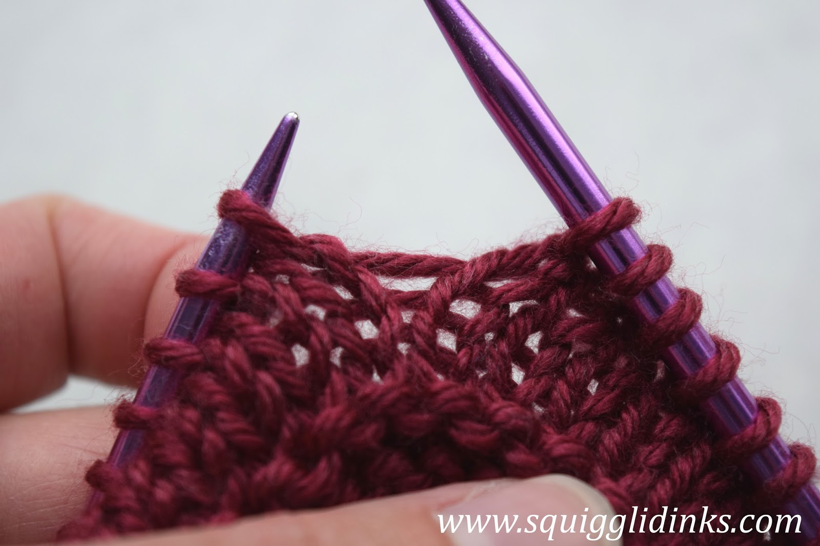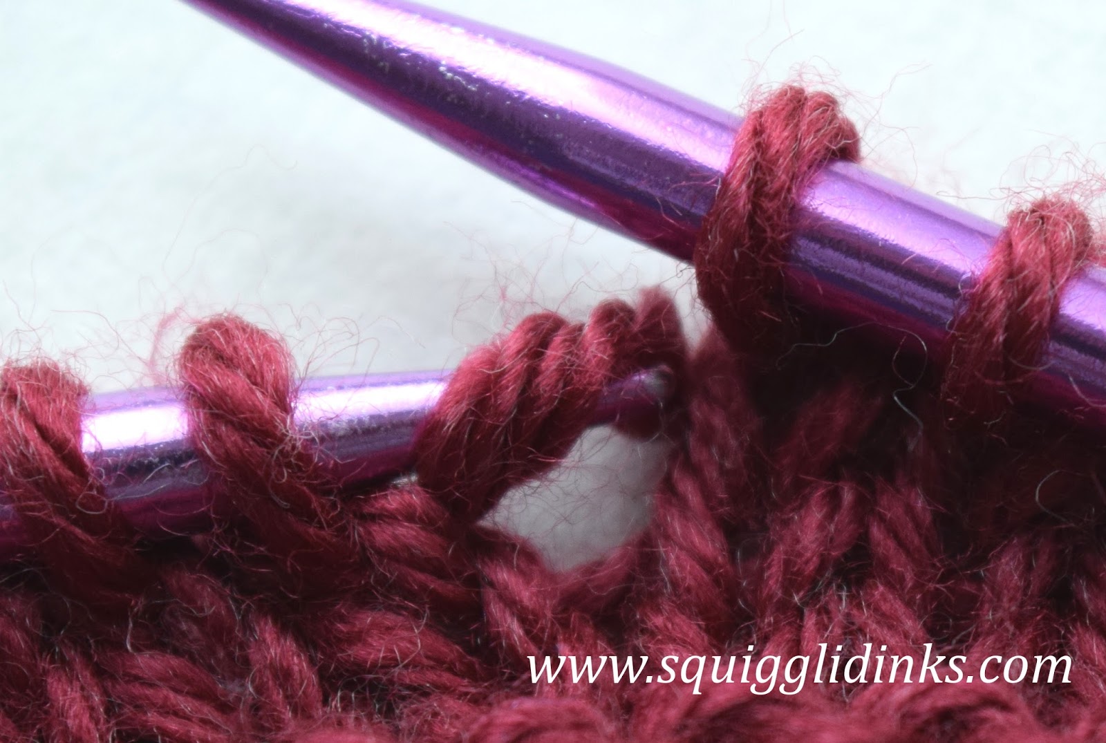 The opposite stitch, make one with a right slant, or m1r, is done very similarly. You start by finding the loop from the last row of stitches that crosses the gap where you want the stitch to go.