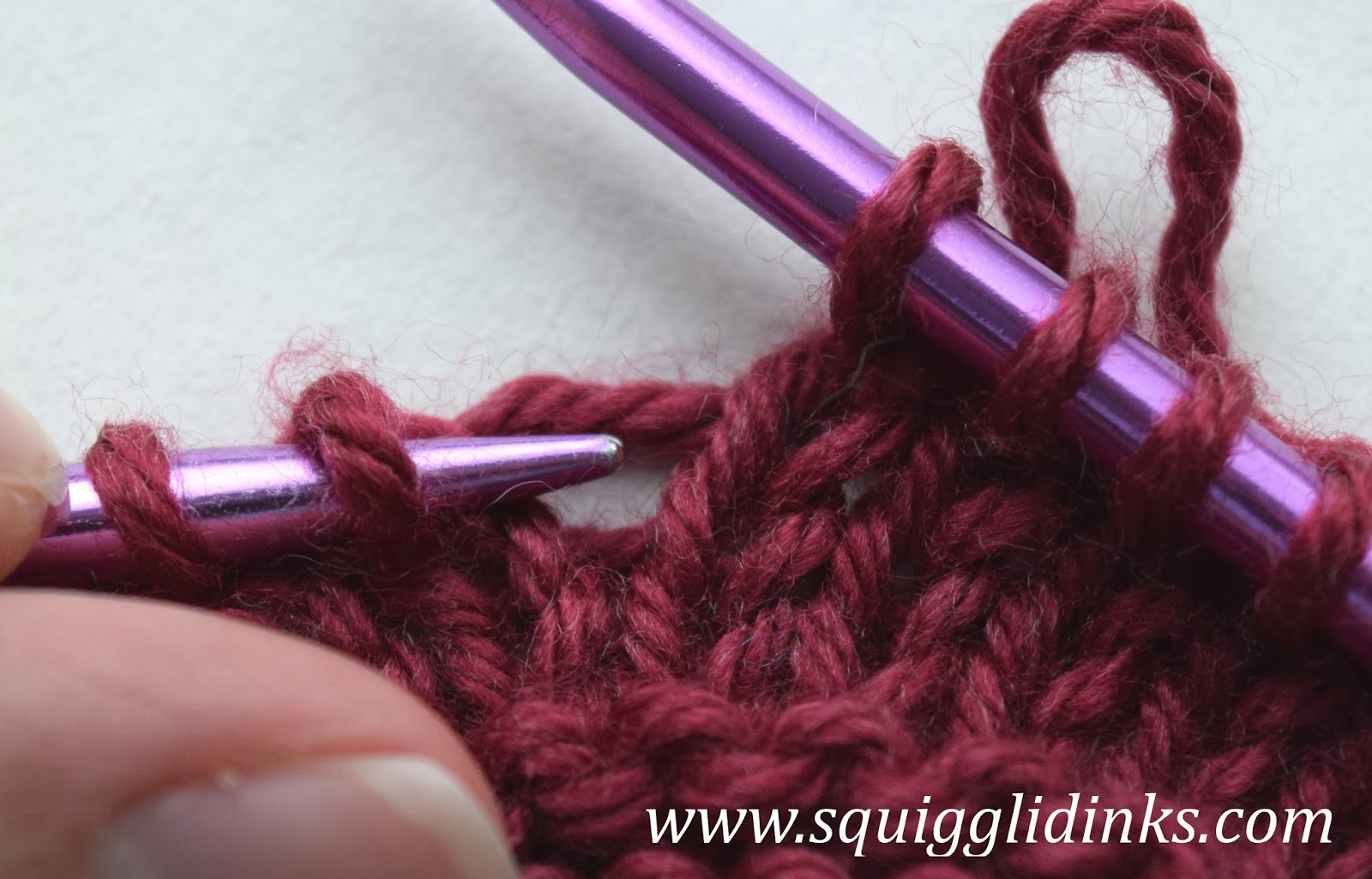 Pick up that loop with your left needle by inserting the needle below the loop moving BACK TO FRONT.