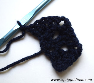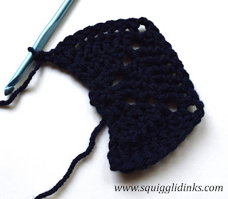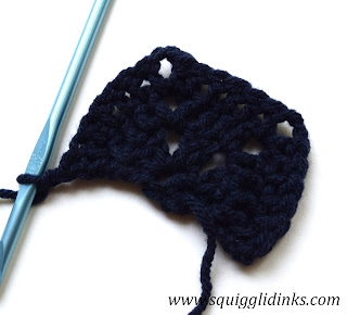 Ch 2, 2 dc into first stitch, ch 2, 2 dc into second stitch, ch 2, 3 dc into third stitch (aka the 3 chains that you started the last row with. Throughout this pattern you’ll treat your starting chains as a stitch.) Turn work.
