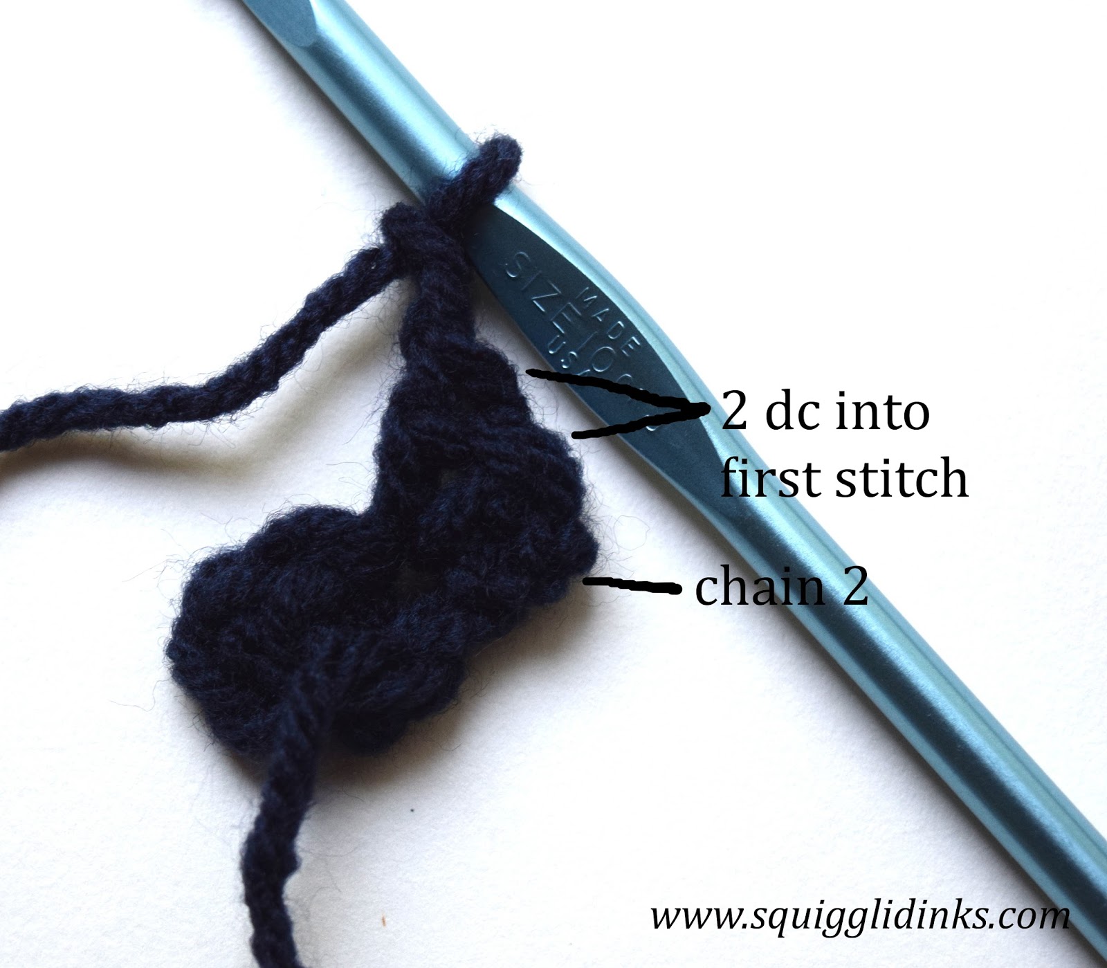 | Dc 1 in the gap between the first and second stitches. |