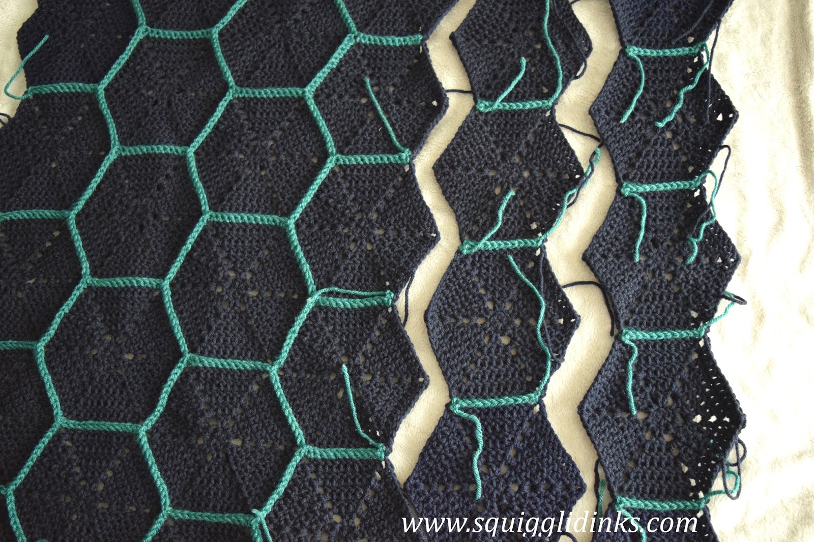 Using peacock yarn and single crochet stitches, join the hexagons together in strips. Five strips will have 8 hexagons. The other five strips will have 7 hexagons plus a half hexagon at either end. Lay them out so that the strips alternate, like in the diagram below.