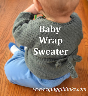 The sweater is reversible–it can either wrap across the front and tie in back (as in my photos of Munchkin), or it can wrap across the back and tie in front. (Below, when I label the increasing/decreasing sections as the front sections, I’m referring to the way I have it on Munchkin.)